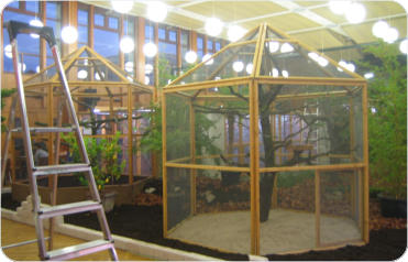 Großräumige und gut ausgeleuchtete Volieren wurden aufgestellt und liebevoll ausgeschmückt, damit die farbenprächtigen Vögel in